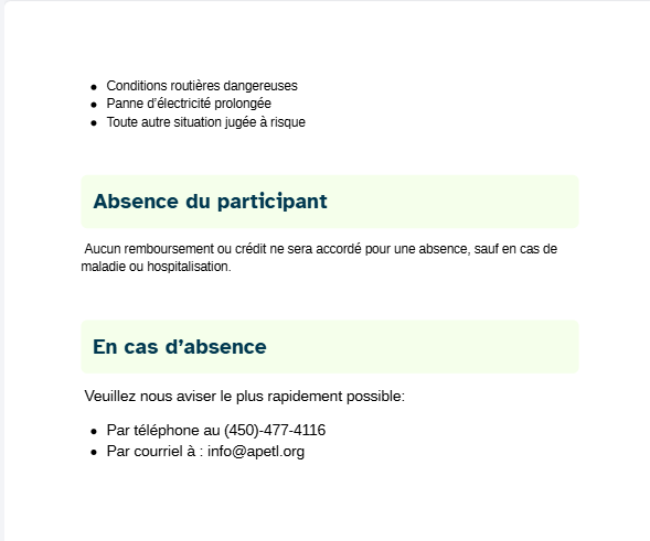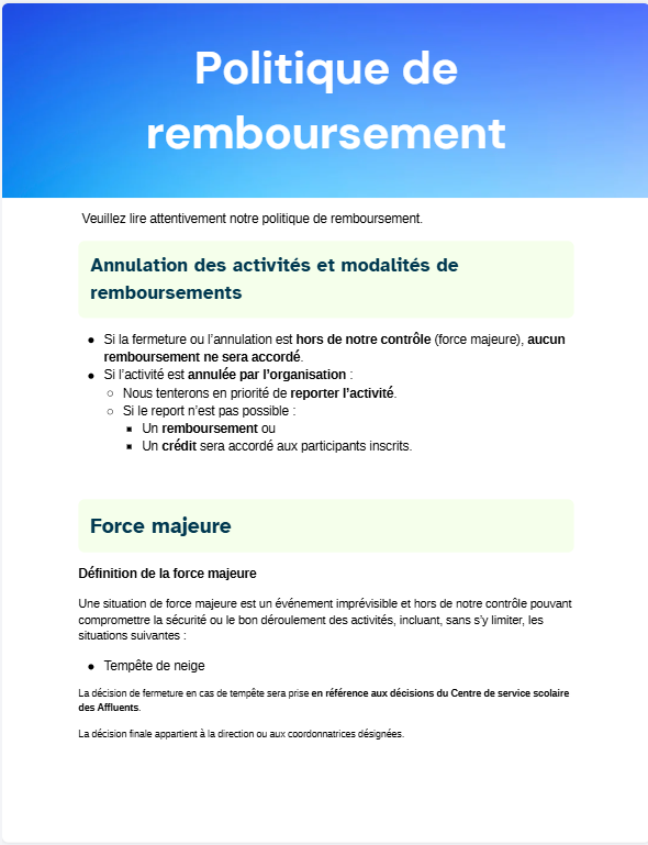 Merci de prendre connaissance de notre politique de remboursement ainsi que des autres modalités.